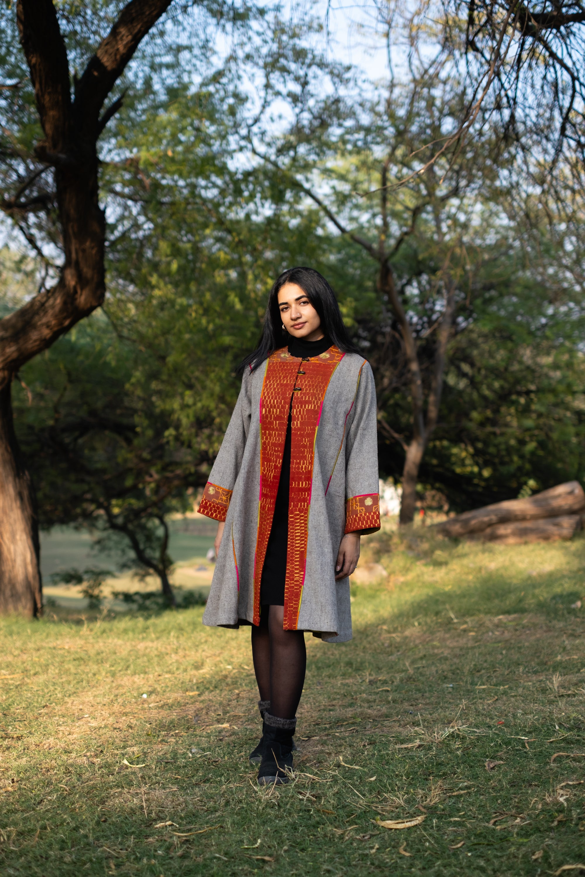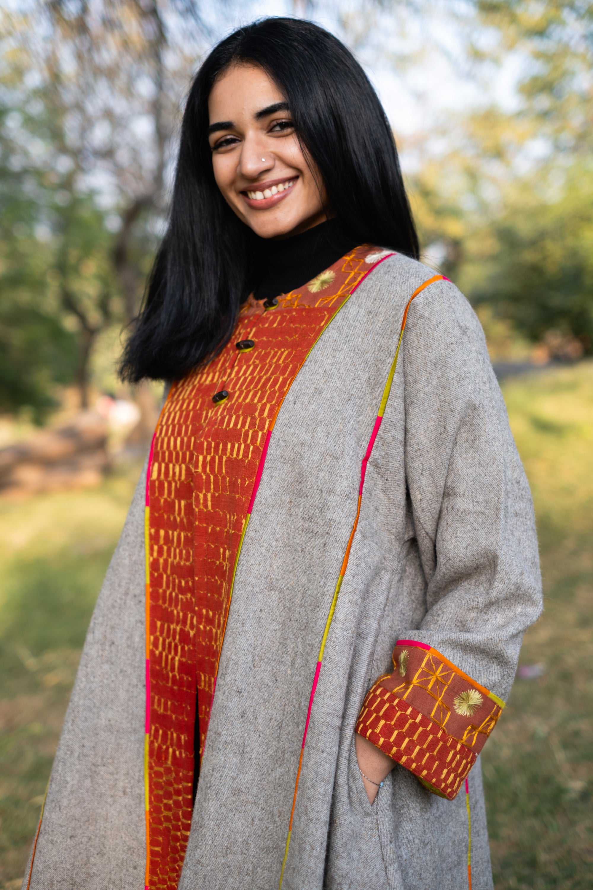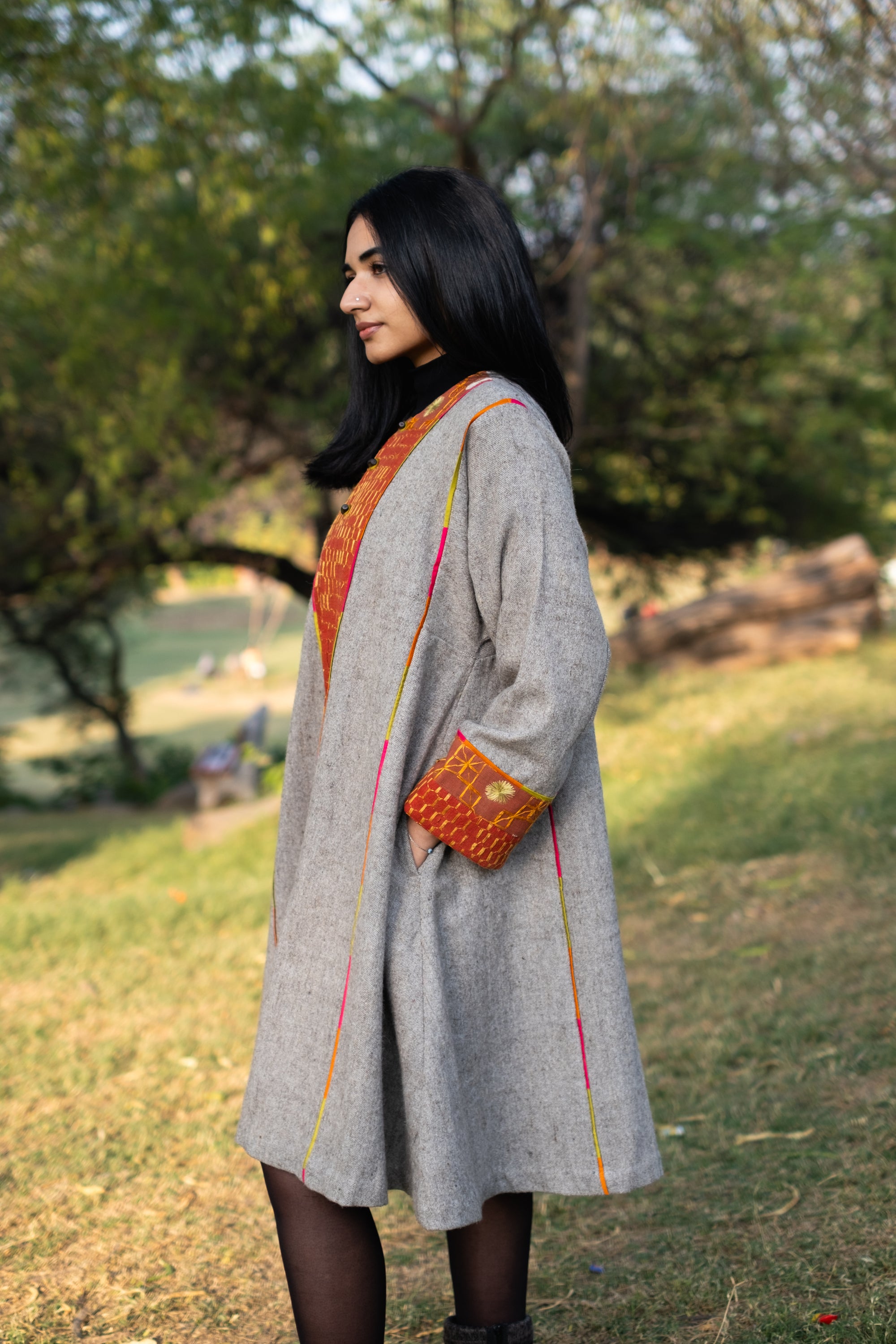 Phulkari On Yak wool A-Line Coat ~ Rust on Grey